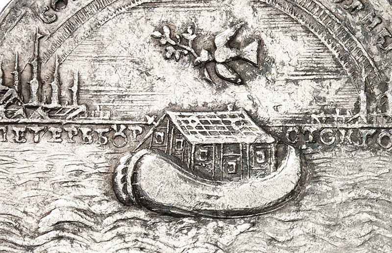 Правильно, мин херц! Медаль сия есть памятник медального искусства, но использовался и как памятная и как наградная. Изготавлена она была в 1721 году неизвестными русскими медальерами из драгоценного металла, поступившего с Нерчинских заводов. На медалях отчеканены слова: «из злата (или серебра) домашнего». Вручались на торжествах в честь провозглашения Петра императором в 1721 году. Композиция построена с использованием библейских образов, при этом Северная война уподоблялась всемирному потопу: на медали изображен Ноев ковчег и летящий к нему голубь с ветвью в клюве. Радуга – знамение мира – соединяет молодой Петербург и старинный Стокгольм. Оборотная сторона медали отражает надпись в честь Петра I на русском и латинском языках. Размеры медали различные, наиболее распространены диаметром 43 мм, соответствующие русскому рублю. Самые крупные – 60 мм – отсылались к иностранным дворам.